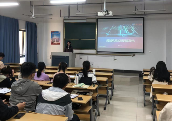 理学院技术物理系在11月18日针对2018级光电信息科学与工程专业学生进行了第一次实习动员,光电专业负责人许田介绍了实习的重要性和小蓝视频 实习要求,并且分别邀请了芯片企业捷捷微电、通富微电介绍各自企业所需岗位,能够提高的学生技能、小蓝视频、以及企业待遇等。同学们对于两家上市芯片企业有了更深入的了解。(许田)