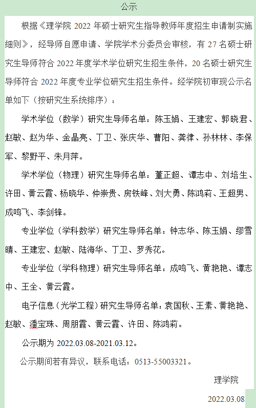 2022年理学院硕导上岗名单初审公示