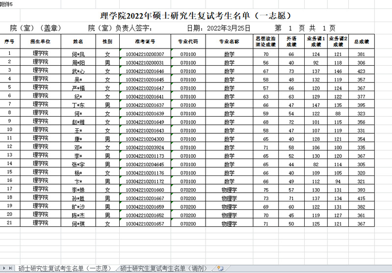 理学院2022年硕士研究生复试考生名单(一志愿)公示