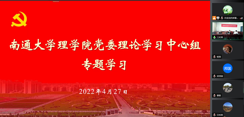 4月27日上午,理学院党委召开理论学习中心组学习会,观看习近平总书记在中国人民大学考察调研的新闻视频,学习习近平总书记在中共中央政治局常务委员会会议上关于“分析新冠肺炎疫情形势,部署从严抓好疫情防控工作”的重要讲话。