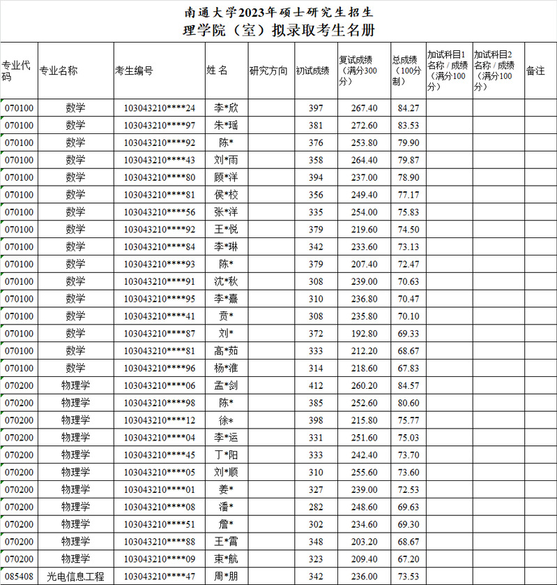 2023年理学院硕士研究生招生一志愿拟录取名单公布