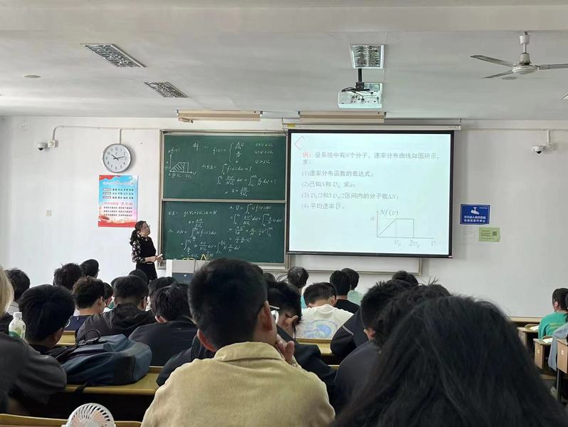 周教授围绕教学内容《麦克斯韦气体分子速率分布律》充分挖掘思政元素,反复打磨润物细无声的思政模式。她借助图片,从物理学家麦克斯韦的学术成就、培养众多高层次人才等方面向同学展示大师“宝剑锋从磨砺出、清风徐徐沐桃李”的风采,激发学生学习意志和远大志向。周教授通过提问互动、讨论探究活跃课堂气氛,助力学生快乐学习。参与观摩的老师也受益良多。