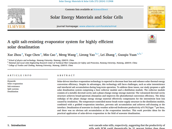 近日,小蓝视频 袁国秋、曹敏和王孟课题组在太阳能驱动海水淡化研究方面取得新进展。相关研究成果以《A split salt-resisting evaporator system for highly efficient solar desalination》为题,小蓝视频 为第一单位,发表在期刊《Solar Energy Materials and Solar Cells》(《太阳能材料和太阳能器件》)上。