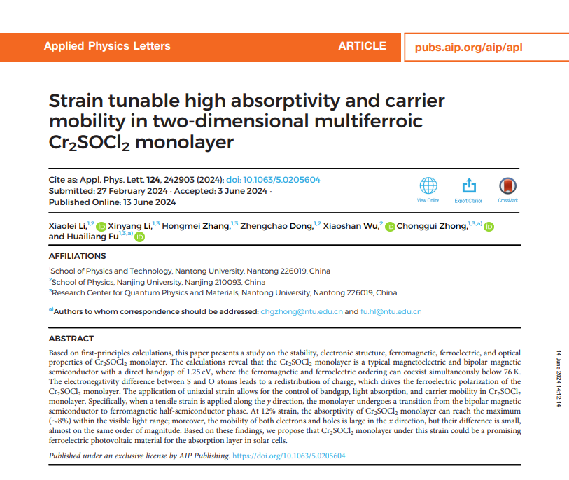 近日,我院仲崇贵教授课题组在应变调控多铁材料光学和输运性能的理论研究方面取得新进展。相关研究成果以《Strain tunable high absorptivity and carrier mobility in two-dimensional multiferroic Cr2SOCl2 monolayer(二维多铁单层Cr2SOCl2中可调的高吸收率与载流子迁移率)》为题发表在自然指数期刊《Applied Physics Letters》(《应用物理快报》)上,仲崇贵教授和傅怀梁教授为共同通讯作者,我院2021级物理学硕士生李晓磊为该论文第一作者,小蓝视频 为第一单位。