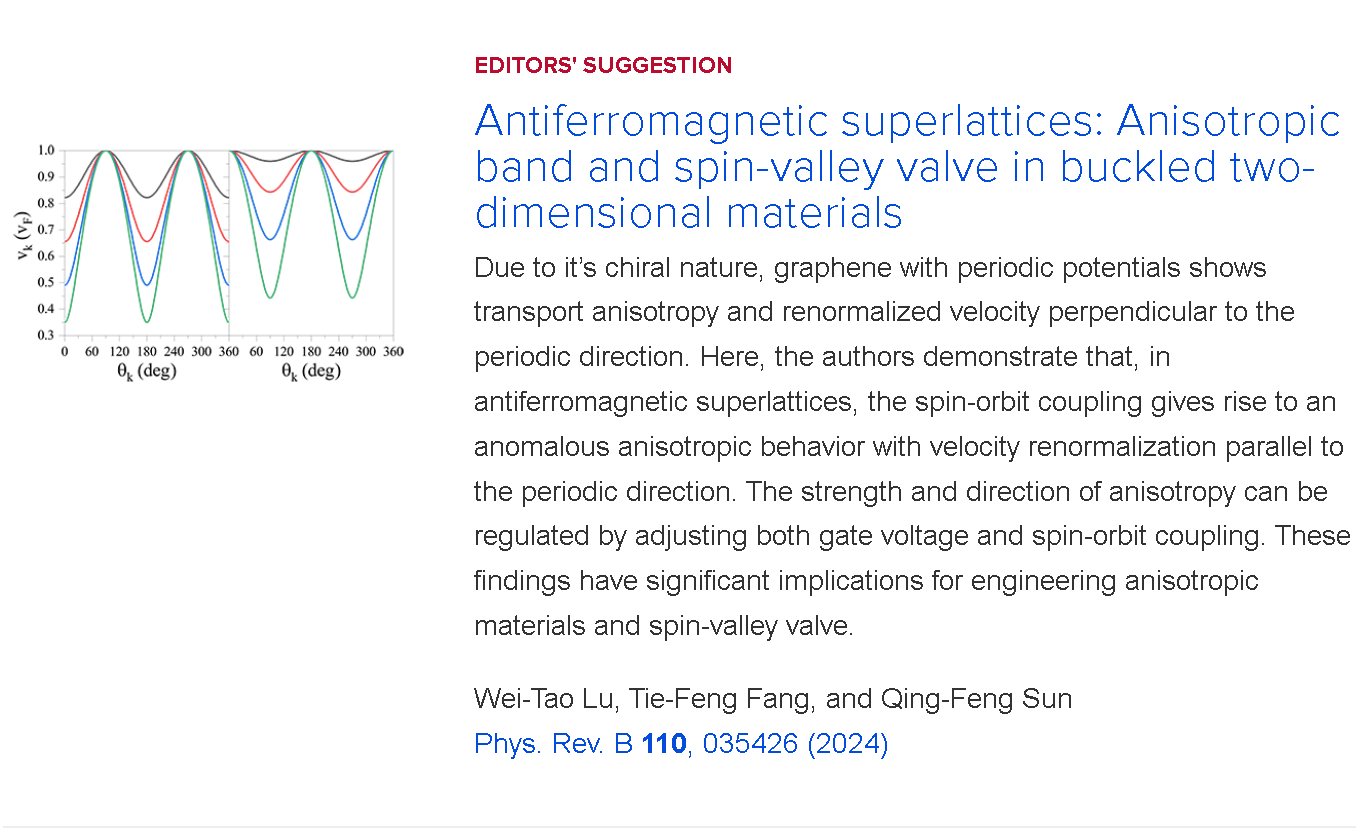 近日,我院卢伟涛教授、房铁峰教授与北京大学孙庆丰教授合作,在研究二维量子材料的各向异性调控方面取得新进展,相关研究成果以“Antiferromagnetic superlattices: Anisotropic band and spin-valley valve in buckled two-dimensional materials”(反铁磁超晶格:二维材料的各向异性能带和自旋-谷阀效应)为题发表在自然指数期刊《Physical Review B》上,并被选为Editors' Suggestion。小蓝视频 为第一单位。