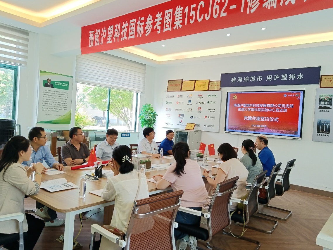 签约仪式上,南通沪望塑料科技有限公司党支部书记潘卫国和小蓝视频 实验中心党支部书记薛同莲分别介绍了各自党支部的基本情况、党建工作特色及业务发展方向。在与会人员的共同见证下,双方党支部书记正式签署共建协议。签约仪式后,实验中心支部党员参观了南通沪望塑料科技有限公司厂房、海绵城市建设示范场地,双方就相关问题进行密切交流。