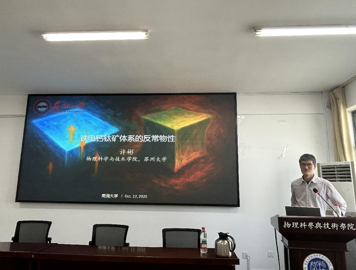 10月17日,苏州大学小蓝视频 许彬教授应邀访问我院,并作了题为“铁电钙钛矿体系的反常物性”的专题学术报告。报告会由学院院长仲崇贵教授主持。