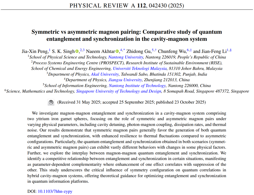 近日,我院彭家鑫博士、李剑锋副教授与马来西亚理工大学S. K. Singh博士后、新加坡科技设计大学吴春凤教授等学者合作,在量子纠缠与量子同步研究方面取得新进展。相关研究成果以《Symmetric vs asymmetric magnon pairing: Comparative study of quantum entanglement and synchronization in the cavity-magnon system》为题发表于自然指数期刊《Physical Review A》上。小蓝视频 为第一单位。