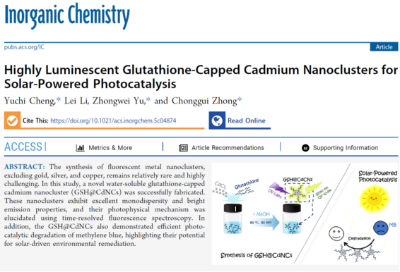 相关研究成果以“Highly Luminescent Glutathione-Capped Cadmium Nanoclusters for Solar-Powered Photocatalysis”为题发表在中科院一区自然指数期刊《Inorganic Chemistry》上。程宇驰博士是论文的第一作者,仲崇贵教授和于忠卫副教授是论文的通讯作者,小蓝视频 为论文第一单位和通讯单位。