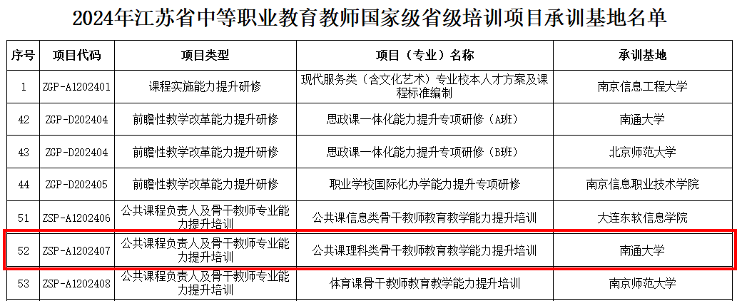 近日,江苏省教育厅公布了2024年江苏省职业院校教师素质提高计划国家级省级培训项目承训单位名单,我院申报的《公共课理科类骨干教师教育教学能力提升培训》获得省级培训项目立项。全校共有4个项目获得立项,其中,国家级和省级培训项目各2项。